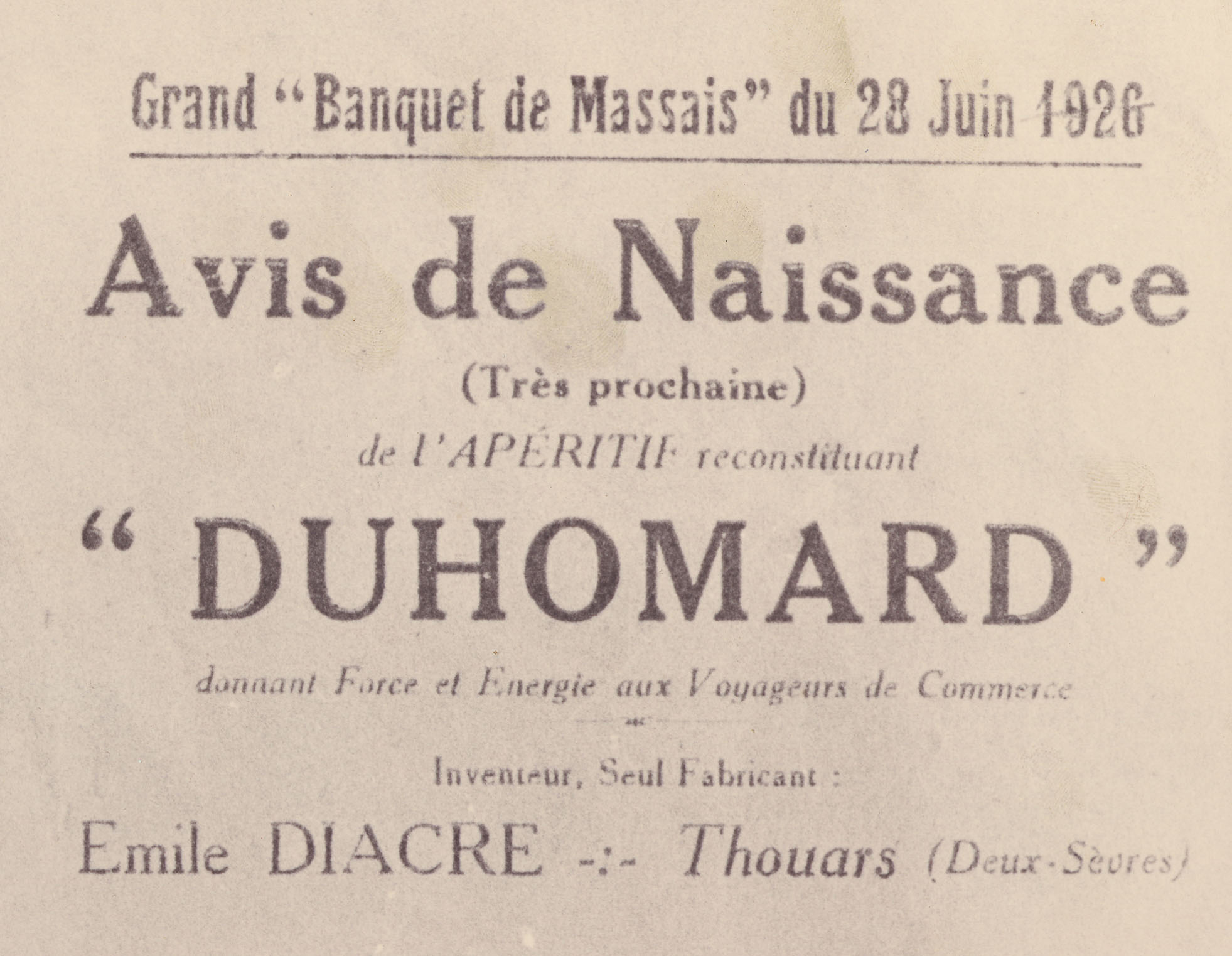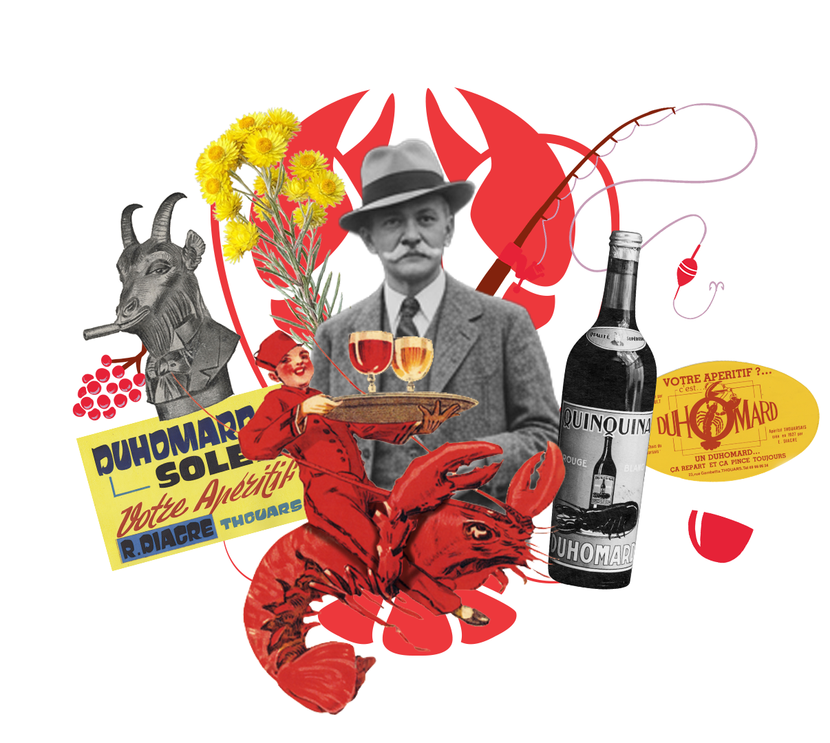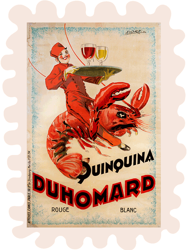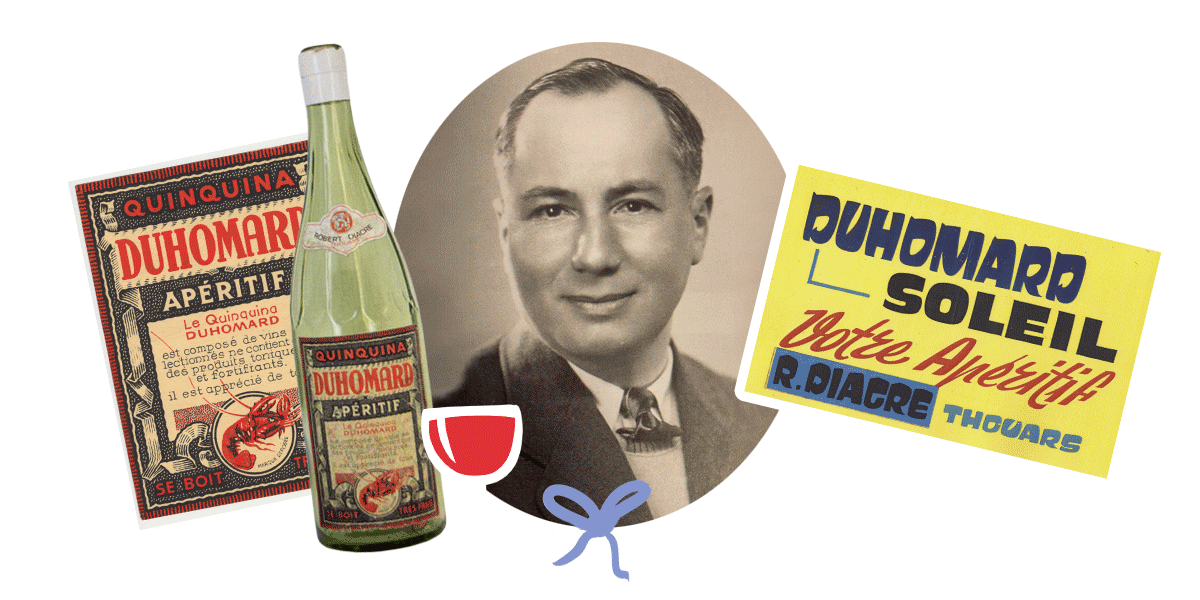 Alors qu’il dirigeait avec son épouse son florissant négoce de vins, bières et limonades à Thouars, Émile Diacre comprit qu’une grande boisson nécessitait une image forte. Pour propulser ses deux créations — le Duhomard Rouge et le Duhomard Blanc — au-delà du cercle des initiés du Banquet de Massais, il initia une stratégie publicitaire audacieuse.