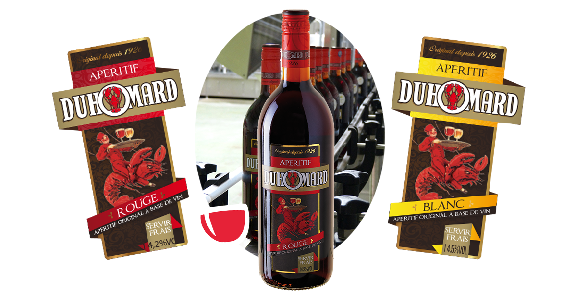 Il confia l’édition d’une affiche à l’imprimeur Camis situé à Paris. C’est le célèbre illustrateur Albert Dorfinant qui créa le graphisme si particulier de cette publicité représentant un groom chevauchant un homard et portant un plateau où se trouvent deux verres ( un de Duhomard rouge et, et l’autre de Duhomard blanc). Cette affiche est encore de nos jours, le symbole de la marque.