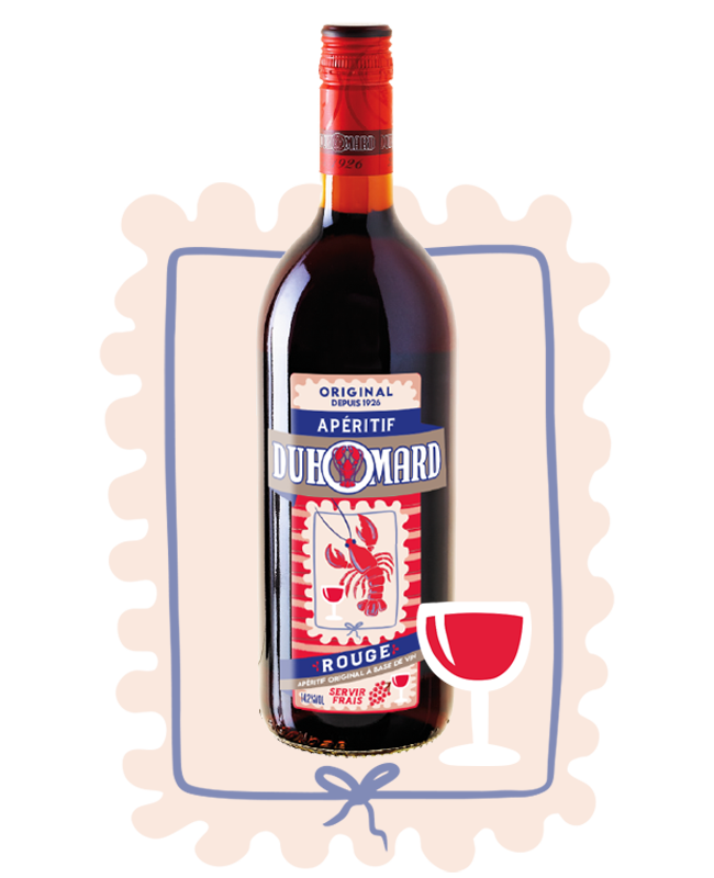 - Dans un grand récipient, mélangez le Duhomard Rouge et le vin rouge.
